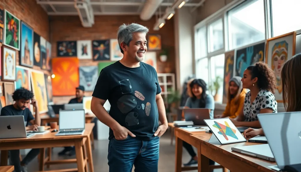 James Gussie discussing digital art with emerging artists in a vibrant studio.